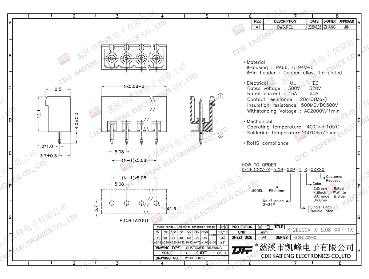 Pluggable Terminal Block MATERIAL:contact: -Pin header: Brass, Tin platedHousing: PA66,UL94V-0ElectricalULIECRated voltage300V 320V Rated current15A20AContact resistance20mΩInsulation resistance500MΩ/DC500VWithstanding voltage AC2000V/1minWire range-MechanicalTemp.rang-40℃~+105℃ Max.soldering+250℃,5secTorque-Strip length-