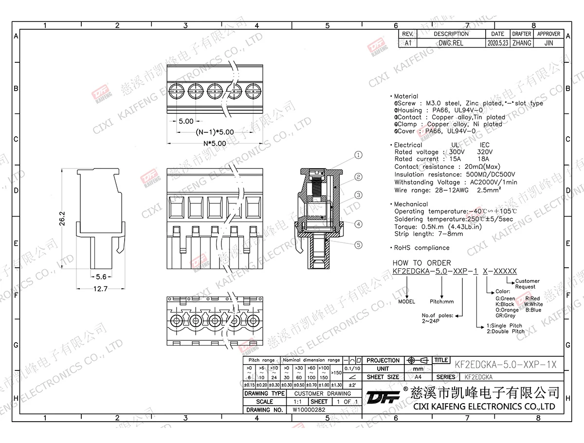 MATERIAL:M2.5,Steel Zinc platedcontact: Phosphor bronzePin header: -Housing: PA66,UL94V-0ElectricalULIECRated voltage300V 320V Rated current15A10AContact resistance20mΩInsulation resistance500MΩ/DC500VWithstanding voltage AC2000V/1minWire range28-12AWG 2.5mm²MechanicalTemp.rang-40℃~+105℃ Max.soldering+250℃, 5s