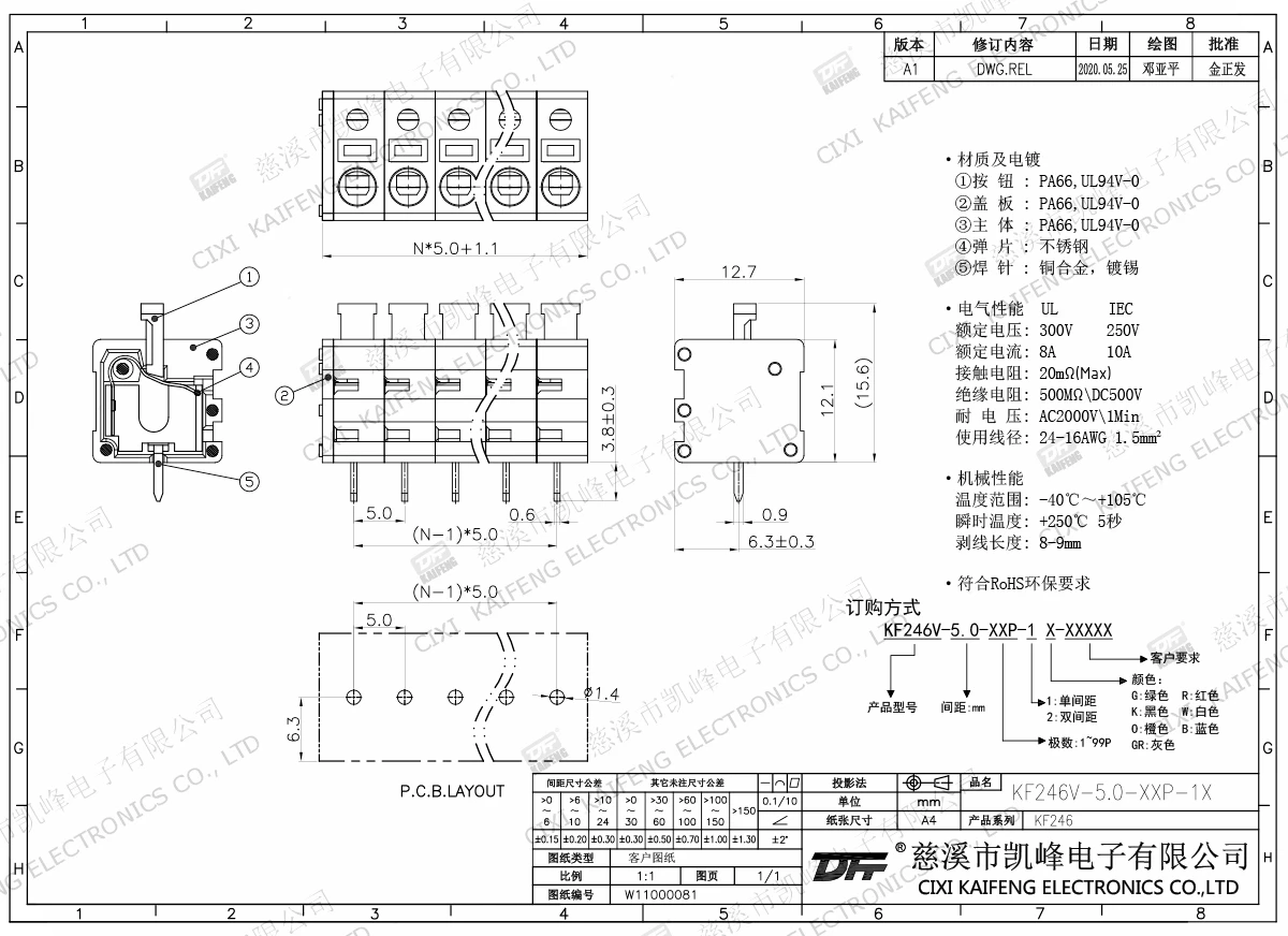 免螺丝式接线端子 材质电镀:①按钮:PA66,UL94V-0②盖板:PA66,UL94V-0③主体:PA66,UL94V-0④弹片:不锈钢⑤焊针:黄铜,镀锡电气性能ULIEC额定电压300V 250V 额定电流8A10A接触电阻20mΩ绝缘电阻500MΩ/DC500V耐电压AC2000V/1min使用线径24-16AWG 1.5mm²机械性能温度范围-40℃~+105℃ 瞬