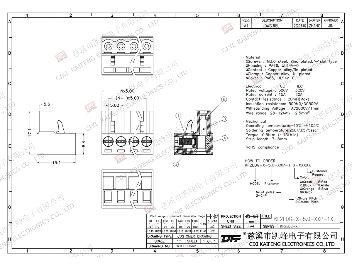 Pluggable Terminal Block MATERIAL:M3.0 Steel Galvanized contact: Phosphor bronzePin header:-Housing: PA66,UL94V-0ElectricalULIECRated voltage300V 320V Rated current15A20AContact resistance20mΩInsulation resistance500MΩ/DC500VWithstanding voltage AC2000V/1minWire range28-12AWG 2.5㎜²MechanicalTemp.rang-40℃~+105℃ Max.soldering+250℃,5se