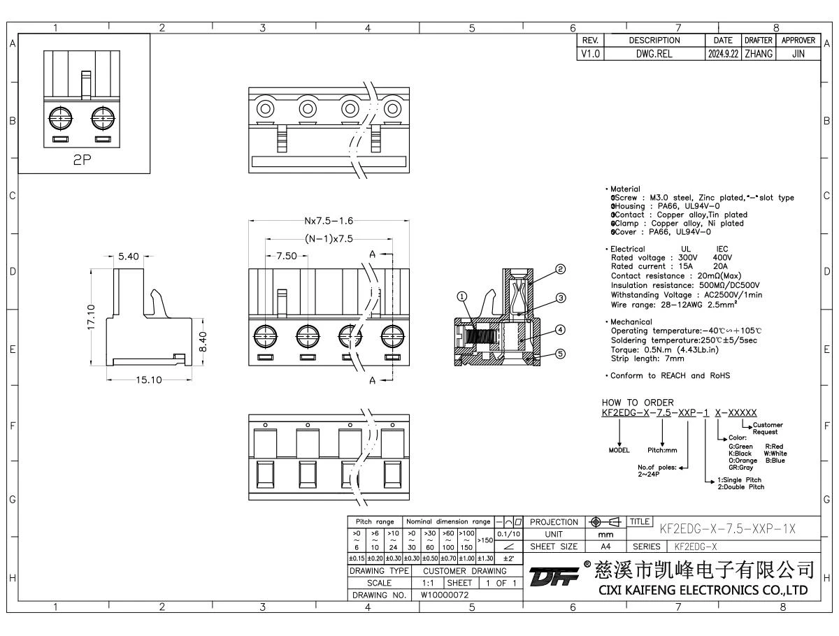 MATERIAL:M2.5,Steel Zinc platedcontact: Phosphor bronzePin header: -Housing: PA66,UL94V-0ElectricalULIECRated voltage300V 400V Rated current15A20AContact resistance20mΩInsulation resistance500MΩ/DC500VWithstanding voltage AC2500V/1minWire range28-12AWG 2.5mm²MechanicalTemp.rang-40℃~+105℃ Max.soldering+250℃, 5s