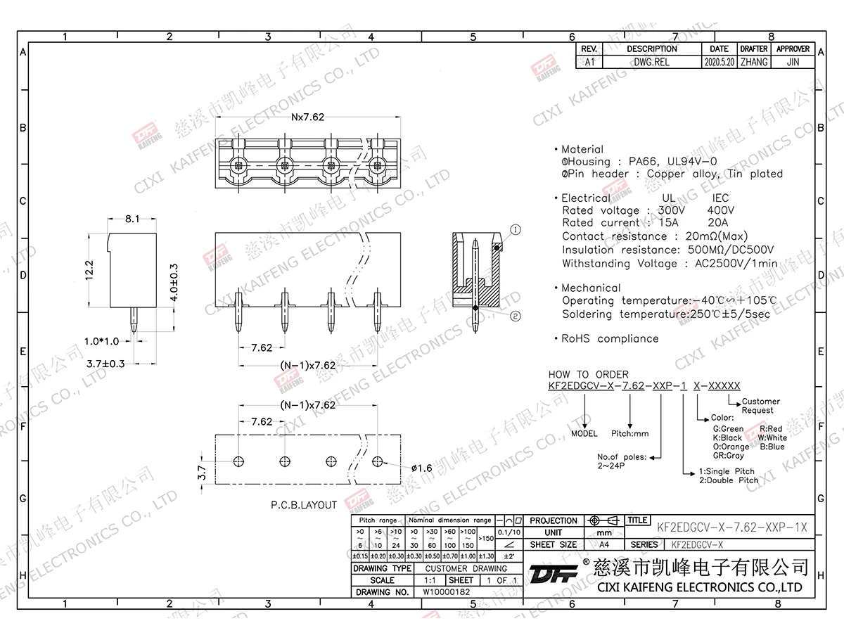Pluggable Terminal Block MATERIAL:M3.0,SteelClip: -contact: -Pin header: Brass, Tin platedHousing: PA66,UL94V-0ElectricalULIECRated voltage300V 400V Rated current15A20AContact resistance20mΩInsulation resistance500MΩ/DC500VWithstanding voltage AC2500V/1minWire range-MechanicalTemp.rang-40℃~+105℃ Max.soldering+250℃, 5secTorque-Strip length-