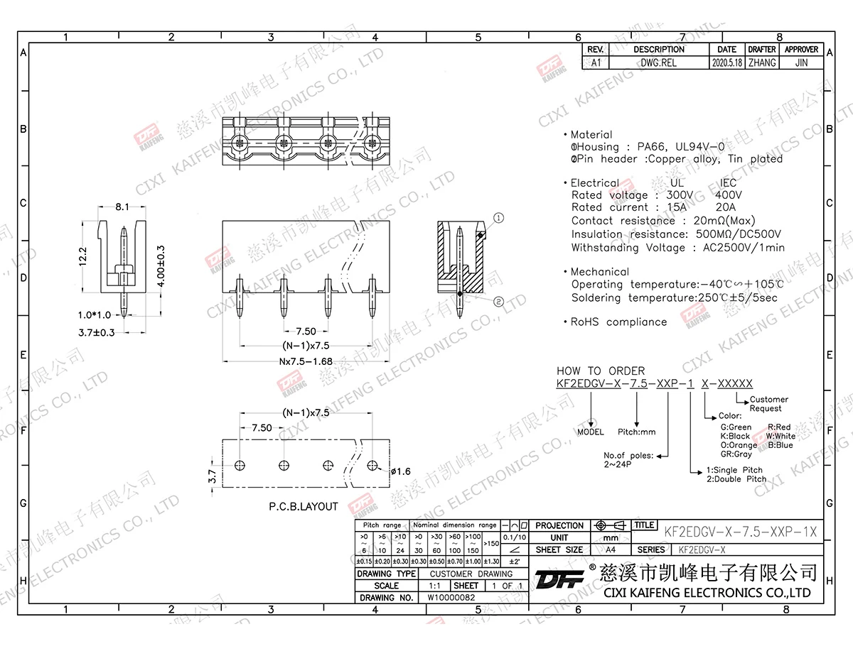 Pluggable Terminal Block MATERIAL:MATERIALScrews: -contact: -Pin header: Brass, Tin platedHousing: PA66,UL94V-0ElectricalULIECRated voltage300V 400V Rated current15A20AContact resistance20mΩInsulation resistance500MΩ/DC500VWithstanding voltage AC2500V/1minWire range-MechanicalTemp.rang-40℃~+105℃ Max.soldering+250℃, 5secTorque-Strip length-