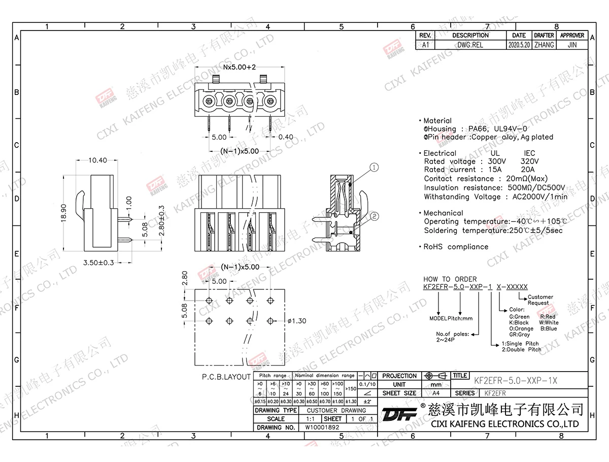 MATERIAL:MATERIALScrews: -contact: -Pin header: Brass, Tin platedHousing: PA66,UL94V-0ElectricalULIECRated voltage300V 320V Rated current15A20AContact resistance20mΩInsulation resistance500MΩ/DC500VWithstanding voltage AC2000V/1minWire range-MechanicalTemp.rang-40℃~+105℃ Max.soldering+250℃, 5secTorque-Strip length-