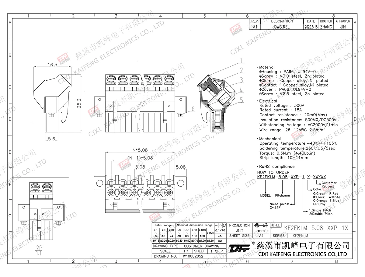Pluggable Terminal Block MATERIAL:MATERIALScrews: M3.0,Stainless steelcontact: Phosphor bronzePin header: -Housing: PA66,UL94V-0ElectricalIECRated voltage300V --Rated current15A--Contact resistance20mΩInsulation resistance500MΩ/DC500VWithstanding voltage AC2000V/1minWire range26-12AWG 2.5mm²MechanicalTemp.rang-40℃~+105℃ Max.soldering+250℃, 5secTorque0.5N.m 5.