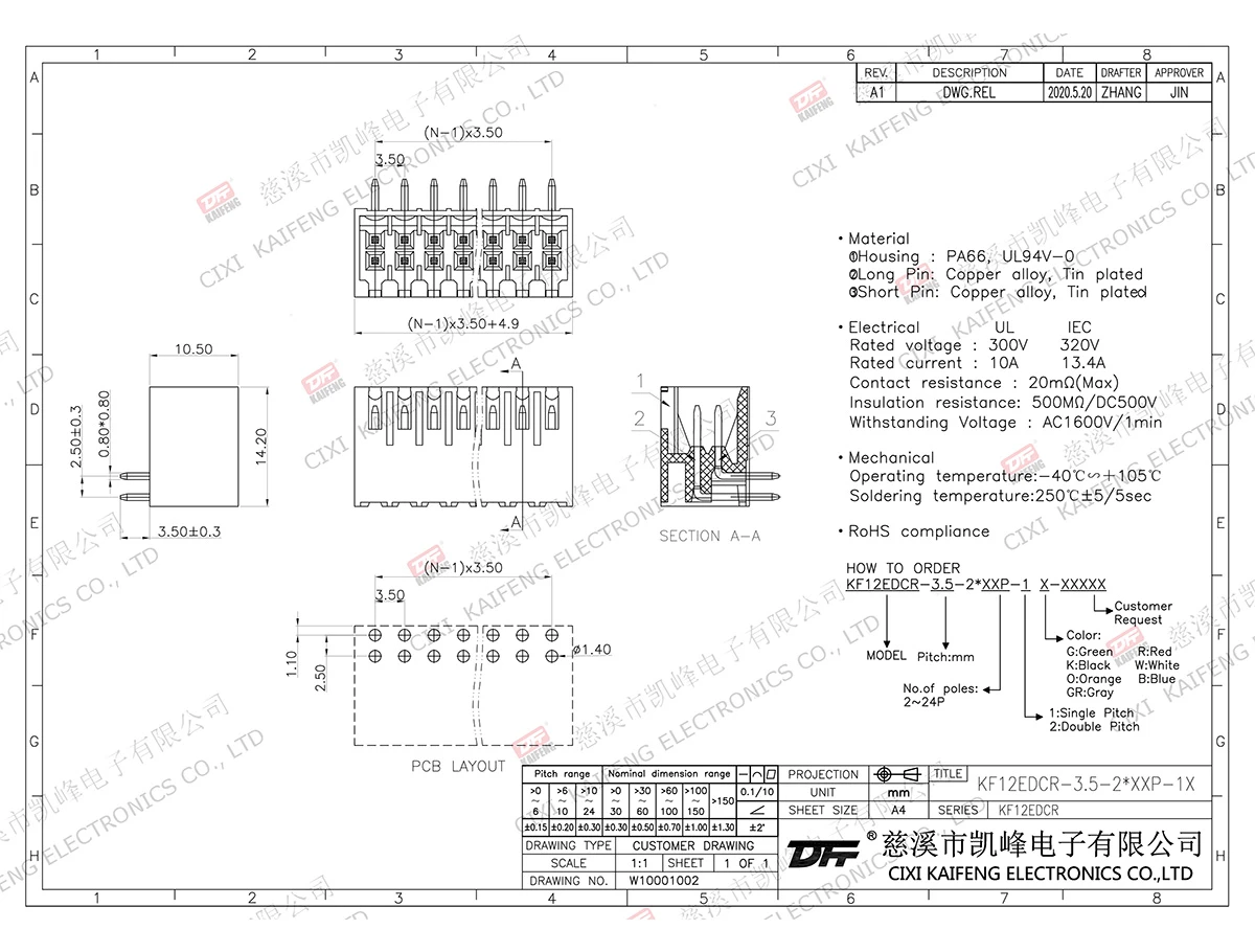 Pluggable Terminal Block MATERIAL:①Welding leg:copper alloy,Tinning②Housing : PA66,UL94V-0 ElectricalUL IEC Rated voltage150V 320V