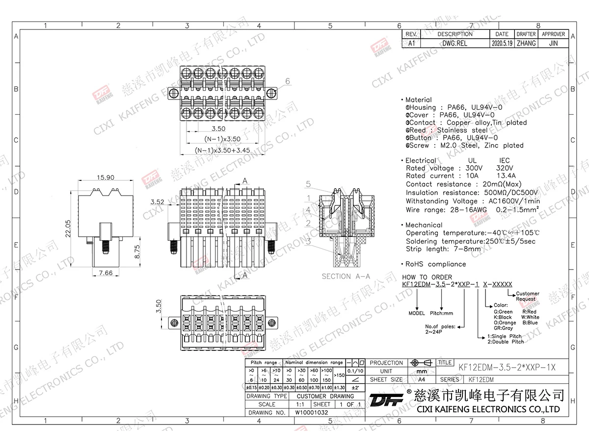 MATERIAL:①Screws:M2.0,Steel Zinc plated②Reed : Stainless steel③Clip : Phosphor bronze,Tinning ④Button : PA66,UL94V-0 ⑤Housing : PA66,UL94V-0 ⑥Cover : PA66,UL94V-0