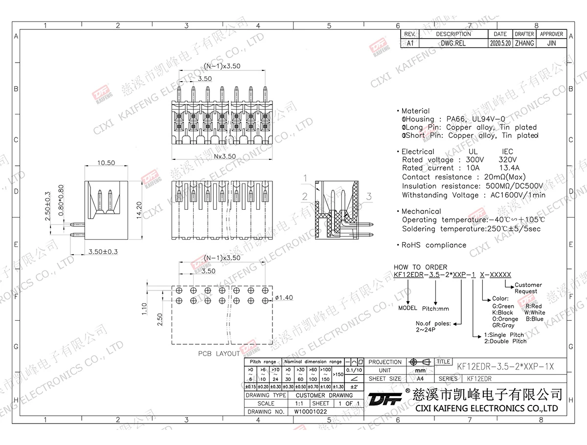 Pluggable Terminal Block MATERIAL:Latest drawing DownloadMATERIAL①Welding leg:copper alloy,Tinning②Housing : PA66,UL94V-0 ElectricalUL IEC Rated voltage150V 320V