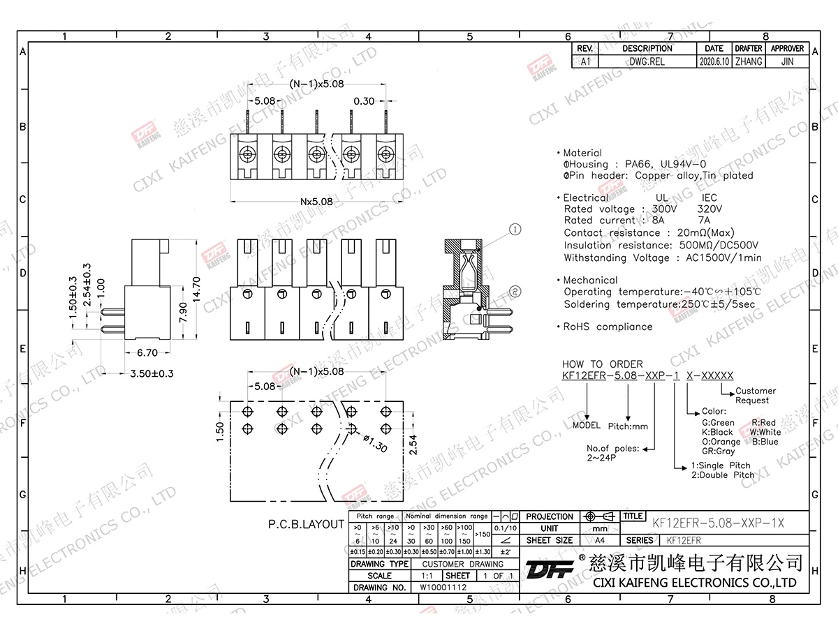 Pluggable Terminal Block MATERIAL:contact:-Pin header:Phosphor bronze,TinningHousing:PA66,UL94V-0ElectricalULIECRated voltage300V250VRated current8A7AContact resistance20mΩInsulation resistance500MΩ/DC500VWithstanding voltage AC1500V/1minWire range-MechanicalTemp.rang-40℃~+105℃Max.soldering+250℃,5secTorque-Strip length-