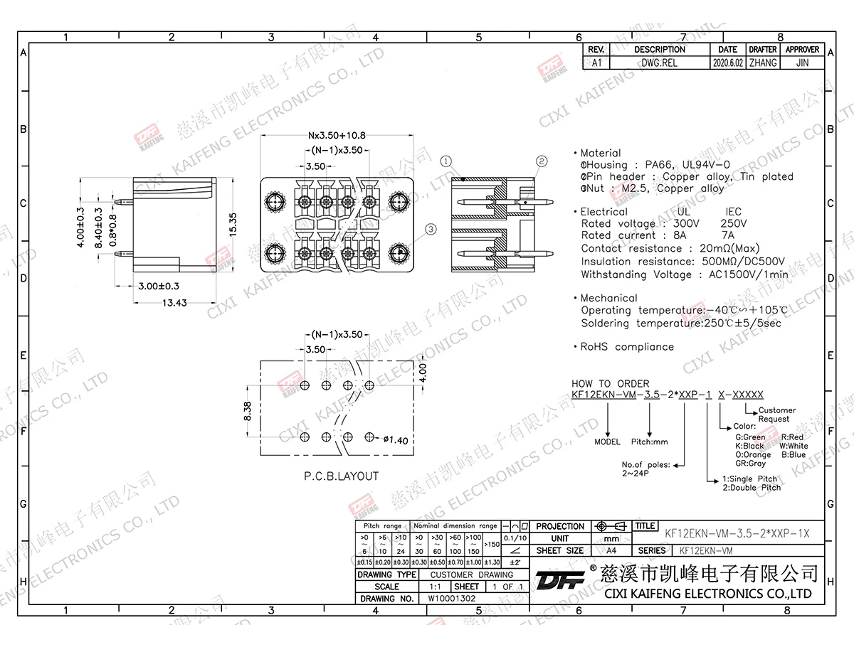 Pluggable Terminal Block MATERIAL:contact: -Pin header: Brass, Tin platedHousing: PA66,UL94V-0ElectricalULIECRated voltage300V 250V Rated current8A7AContact resistance20mΩInsulation resistance500MΩ/DC500VWithstanding voltage AC2000V/1minWire range-MechanicalTemp.rang-40℃~+105℃ Max.soldering+250℃, 5secTorque-Strip length-