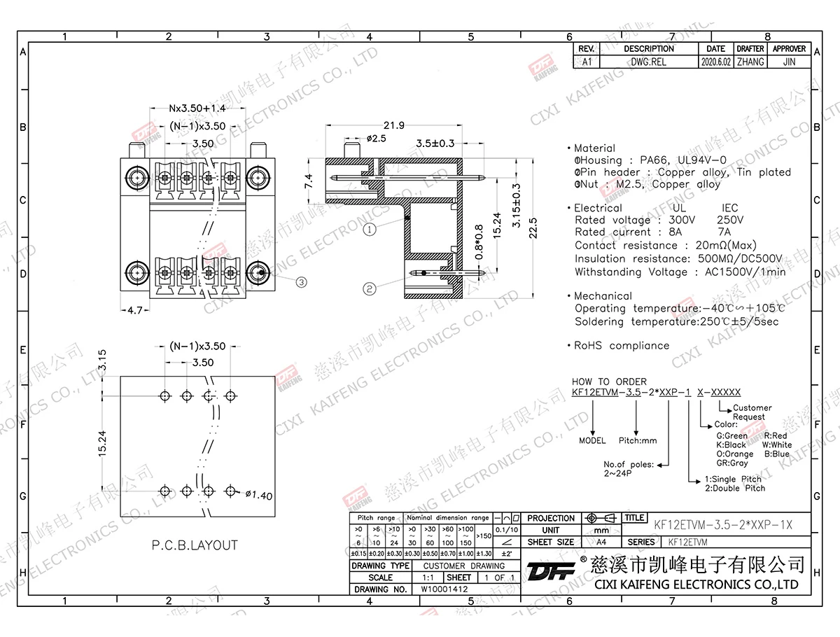 Pluggable Terminal Block MATERIAL:contact: -Pin header: Brass, Tin platedHousing: PA66,UL94V-0ElectricalULIECRated voltage300V 250V Rated current8A7AContact resistance20mΩInsulation resistance500MΩ/DC500VWithstanding voltage AC1500V/1minWire range-MechanicalTemp.rang-40℃~+105℃ Max.soldering+250℃, 5secTorque-Strip length-