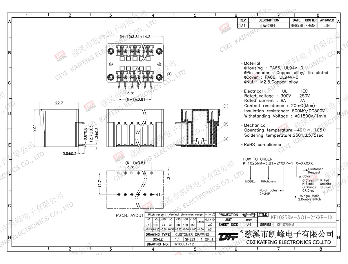 MATERIAL:contact: -Pin header: Brass, Tin platedHousing: PA66,UL94V-0ElectricalULIECRated voltage300V 250V Rated current8A7AContact resistance20mΩInsulation resistance500MΩ/DC500VWithstanding voltage AC1500V/1minWire range-MechanicalTemp.rang-40℃~+105℃ Max.soldering+250℃, 5secTorque-Strip length-