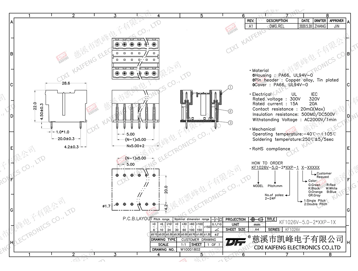 MATERIAL:MATERIALScrews: -contact: -Pin header: Brass, Tin platedHousing: PA66,UL94V-0ElectricalULIECRated voltage300V 320V Rated current15A20AContact resistance20mΩInsulation resistance500MΩ/DC500VWithstanding voltage AC2000V/1minWire range-MechanicalTemp.rang-40℃~+105℃ Max.soldering+250℃, 5secTorque-Strip length-