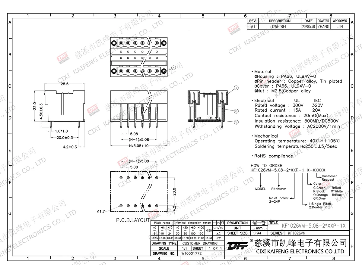 Pluggable Terminal Block MATERIAL:MATERIALScrews: -contact: -Pin header: Brass, Tin platedHousing: PA66,UL94V-0ElectricalULIECRated voltage300V 320V Rated current15A20AContact resistance20mΩInsulation resistance500MΩ/DC500VWithstanding voltage AC2000V/1minWire range-MechanicalTemp.rang-40℃~+105℃ Max.soldering+250℃, 5secTorque-Strip length-