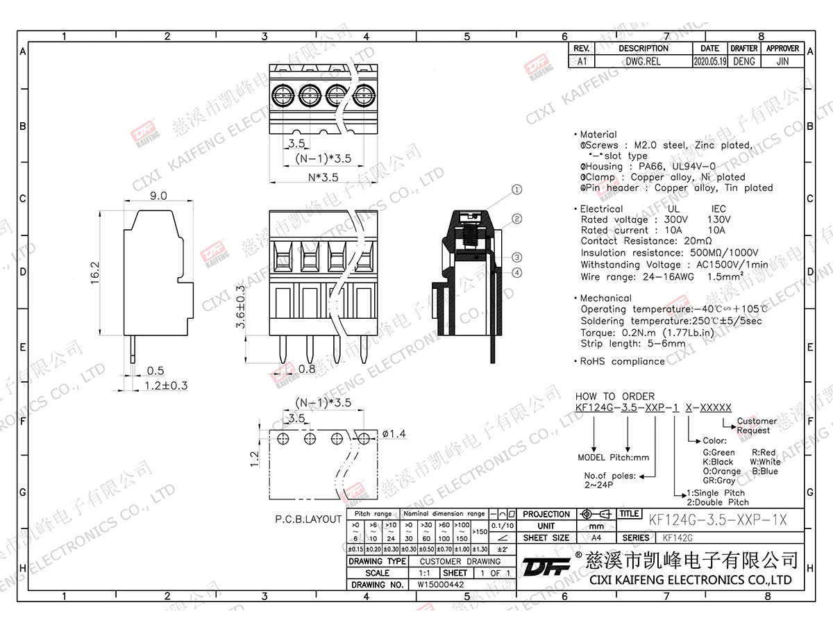 PCB Terminal Block MATERIAL:Screws(Screw):M2.0Steel Zinc plated(Steel,ZincPlated)Housing(Housing):PA66,UL94V-0·ELECTRICAL(Electrical)Rated voltage(RatedVoltage):150VRated current(RatedCurrent):10AContact resistance(ContactResistance):20mΩInsulation resistance(InsulationResistance):5