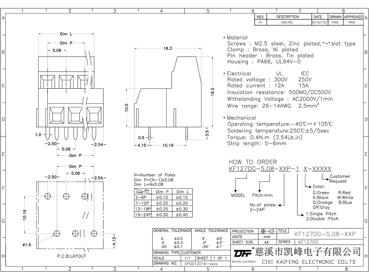 PCB Terminal Block MATERIAL:MATERIAL①Screws:M2.5Steel Zinc plated,"-"slot type②Housing:PA66,UL94V-0③square box:Brass, Tin plated④Pin header:Brass, Tin platedELECTRICALULIECRated voltage300V250VRated current12A15AContact resistance20mΩ(Max)Insulation resistance500MΩ\DC500VWithstanding voltage AC2000V\1MinWire range26-14AWG2.5mm²MechanicalTemp.rang-40℃~+105℃Max.soldering+250℃,5secTorque0.4N