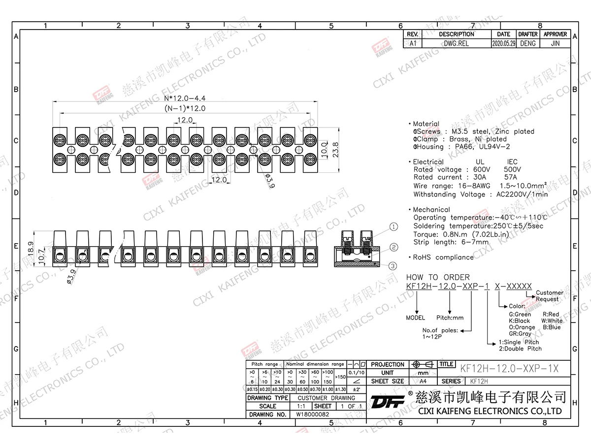 PCB Terminal Block MATERIAL:Screws:M3.5,Steel Zinc plated②block:Brass, Tin plated③Housing:Nylon PA66(UL94V-2) ELECTRICALULIECRated voltage600V 500V Rated current30A57AELECTRICAL16-8AWG 1.5-10.0mm²MechanicalTemp.rang-40℃~+110℃ Max.soldering+250℃ 5 secondsProduct numberKF12HBasehighH XPNo.of pol