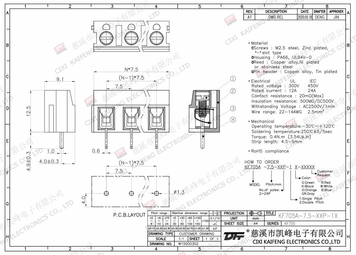 Screws:M2.5 Steel Zinc plated,"-"slot type 丨 Select:- 丨 Pin header:Copper alloy,Tin plated 丨 Housing:PA66, UL94V- 0 丨 Electrical:ULIEC 丨 Rated voltage:300V-450V 丨 Rated current:12A-24A 丨 Contact resistance:20mΩ(Max) 丨 Insulation resistance:500MΩ/DC500V 丨 Withstanding voltage :AC2500V/1min 丨 Wire range:22-14AWG 2.5mm² 丨 MechanlicalTemp.rang:-30℃~+120℃ 丨 Max.soldering:+250℃,5sec