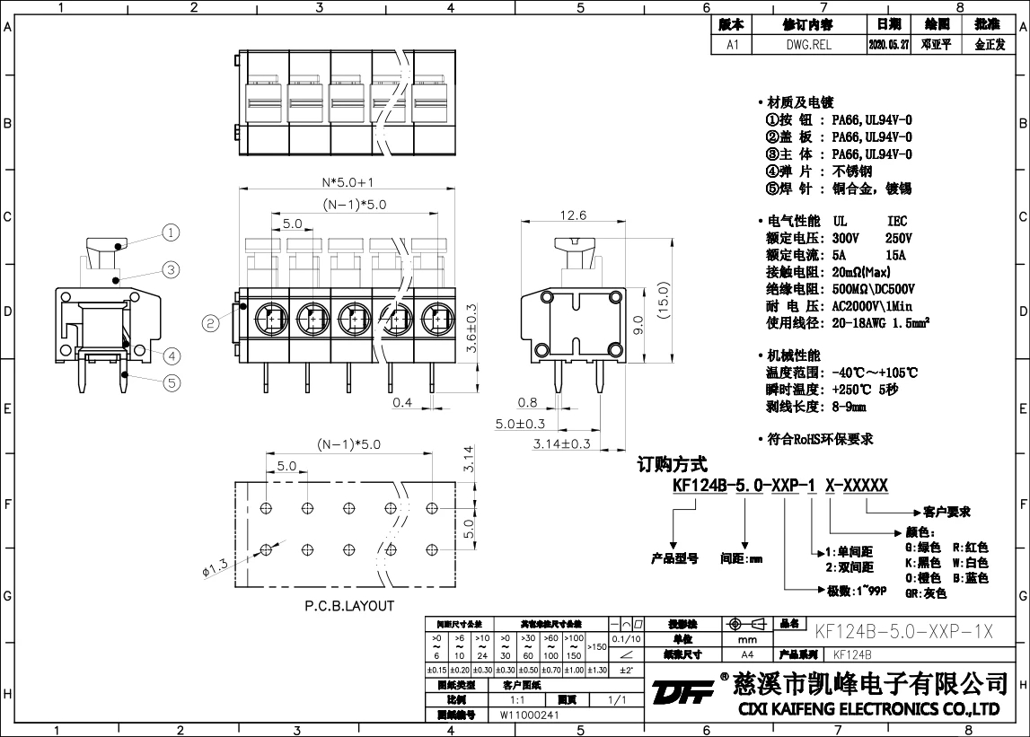 Terminal Material:①Button:PA66,UL94V-0②Cover:PA66,UL94V-0③Button:PA66,UL94V-0④Reed:Stainless steel⑤Pin header:Brass,Tin platedElectricalULIECRated voltage300V 250V Rated current5A 10AContact resistance20mΩInsulation resistance500MΩ/DC500VWithstanding voltage AC2000V/1minWire range20-18AWG 1.5mm²MechanlicalTemp.rang-40℃