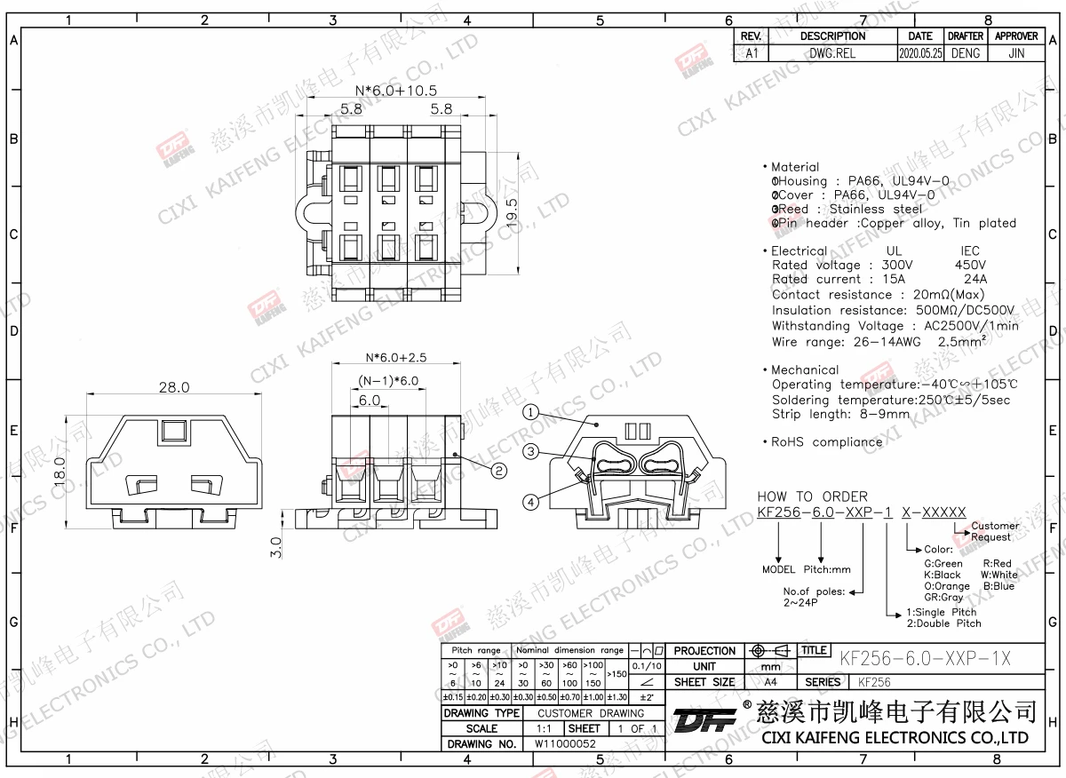 Terminal Material:①Cover:PA66,UL94V-0②Button:PA66,UL94V-0③Reed:Stainless steel④Pin header:Brass,Tin platedElectricalULIECRated voltage300V 450V Rated current15A24AContact resistance20mΩInsulation resistance500MΩ/DC500VWithstanding voltage AC2500V/1minWire range26-14AWG 2.5mm²MechanlicalTemp.rang-40℃~+105℃ Max.soldering+250℃,5secTorque-Strip length