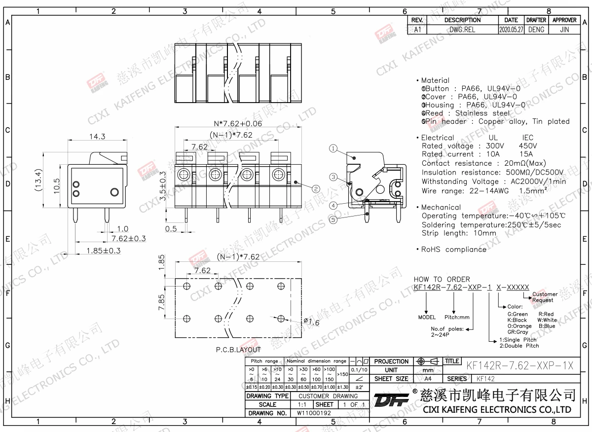 Material:①Button:PA66,UL94V-0②Cover:PA66,UL94V-0③Button:PA66,UL94V-0④Reed:Stainless steel⑤Pin header:Brass,Tin platedElectricalULIECRated voltage300V 250V Rated current10A15AContact resistance20mΩInsulation resistance500MΩ/DC500VWithstanding voltage AC2000V/1minWire range22-14AWG 1.5mm²MechanlicalTemp.rang-40℃~+105℃ Max.soldering+250℃,5sec