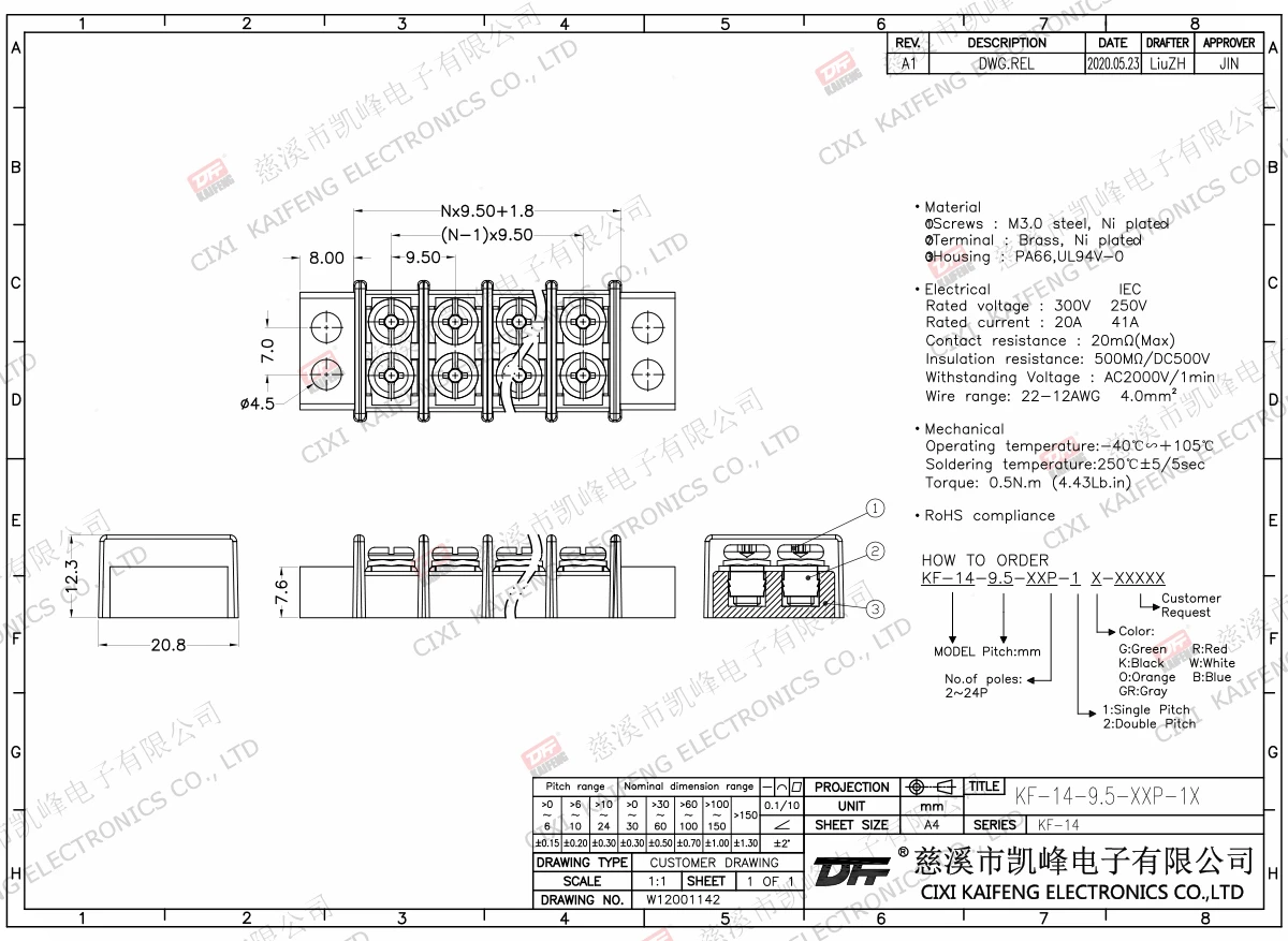 M3.0 Steel,Ni platedTerminal:Brass,0.7t Ni platedHousing: PA66,UL94V-0ElectricalULIECRated voltage300V 250V Rated current30A41AInsulation resistance500MΩ/DC500VWithstanding voltage AC2000V/1minWire range22-10AWG 6.0mm²MechanlicalTemp.rang-40℃~+105℃ Torque0.5N.m 4.4Lb.in
