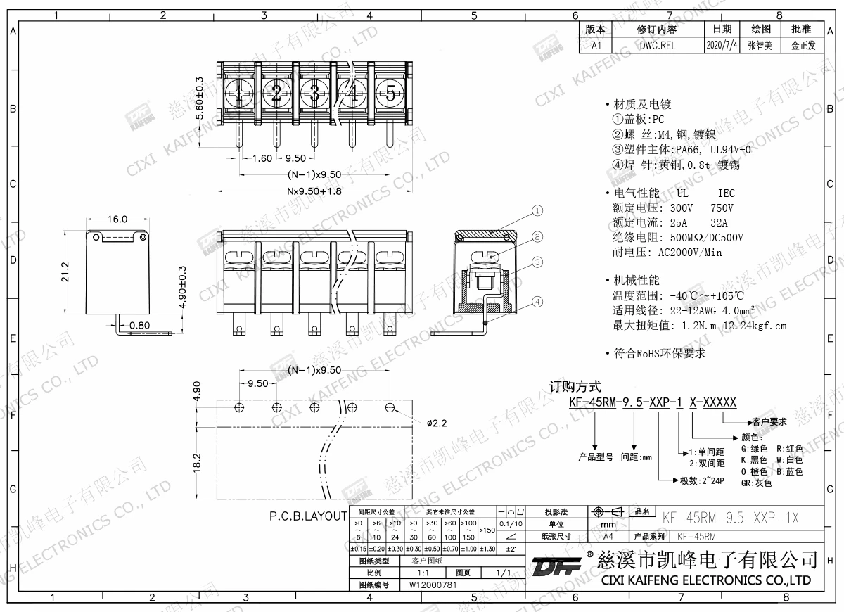 Material:M4.0 Steel,Ni platedTerminal:Brass,0.8t Ni platedHousing: PA66,UL94V-0ElectricalULIECRated voltage300V 750V Rated current25A32AInsulation resistance500MΩ/DC500VWithstanding voltage AC2000V/1minWire range22-12AWG 4.0mm²MechanlicalTemp.rang-40℃~+105℃ Torque1.2N.m 10.53Lb.in