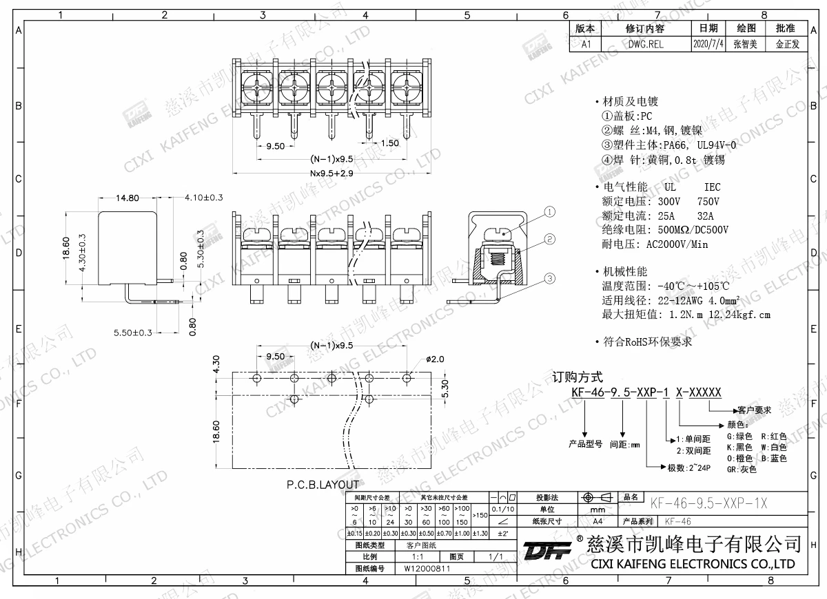Material:M4.0Steel,Ni platedTerminal:Brass,0.8tNi platedHousing:PA66,UL94V-0ElectricalULIECRated voltage300V750VRated current25A32AInsulation resistance500MΩ/DC500VWithstanding voltage AC2000V/1minWire range22-12AWG4.0mm²MechanlicalTemp.rang-40℃~+105℃Torque1.2N.m10.53Lb.in