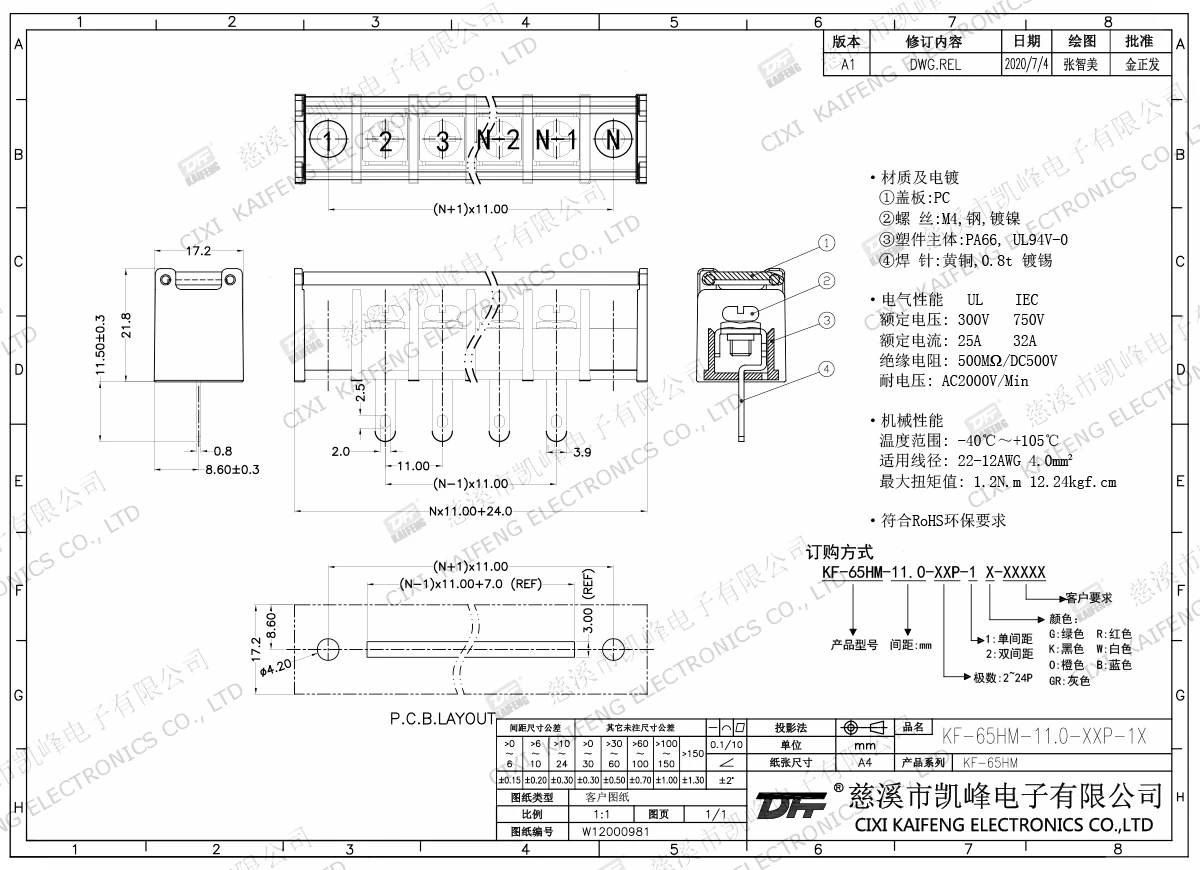 Material:M4.0 Steel,Ni platedTerminal:Brass,0.8t Ni platedHousing: PA66,UL94V-0ElectricalULIECRated voltage300V 750V Rated current30A32AInsulation resistance500MΩ/DC500VWithstanding voltage AC2000V/1minWire range22-12AWG 4.0mm²MechanlicalTemp.rang-40℃~+105℃ Torque1.2N.m 10.53Lb.in