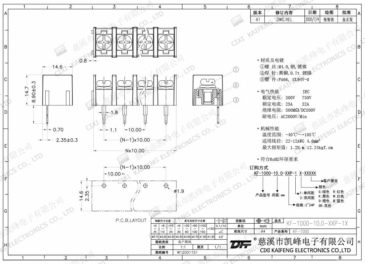 Material:M4.0 Steel,Ni platedTerminal:Brass,0.7t Ni platedHousing: PA66,UL94V-0ElectricalULIECRated voltage300V 750V Rated current25A32AInsulation resistance500MΩ/DC500VWithstanding voltage AC2000V/1minWire range22-12AWG 4.0mm²MechanlicalTemp.rang-40℃~+105℃ Torque1.2N.m 10.53Lb.in