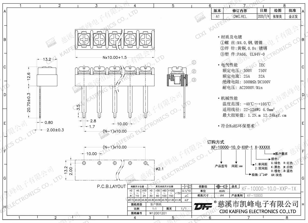 Material:M4.0 Steel,Ni platedTerminal:Brass,0.8t Ni platedHousing: PA66,UL94V-0ElectricalULIECRated voltage300V 750V Rated current25A32AInsulation resistance500MΩ/DC500VWithstanding voltage AC2000V/1minWire range22-12AWG 4.0mm²MechanlicalTemp.rang-40℃~+105℃ Torque1.2N.m 10.53Lb.in