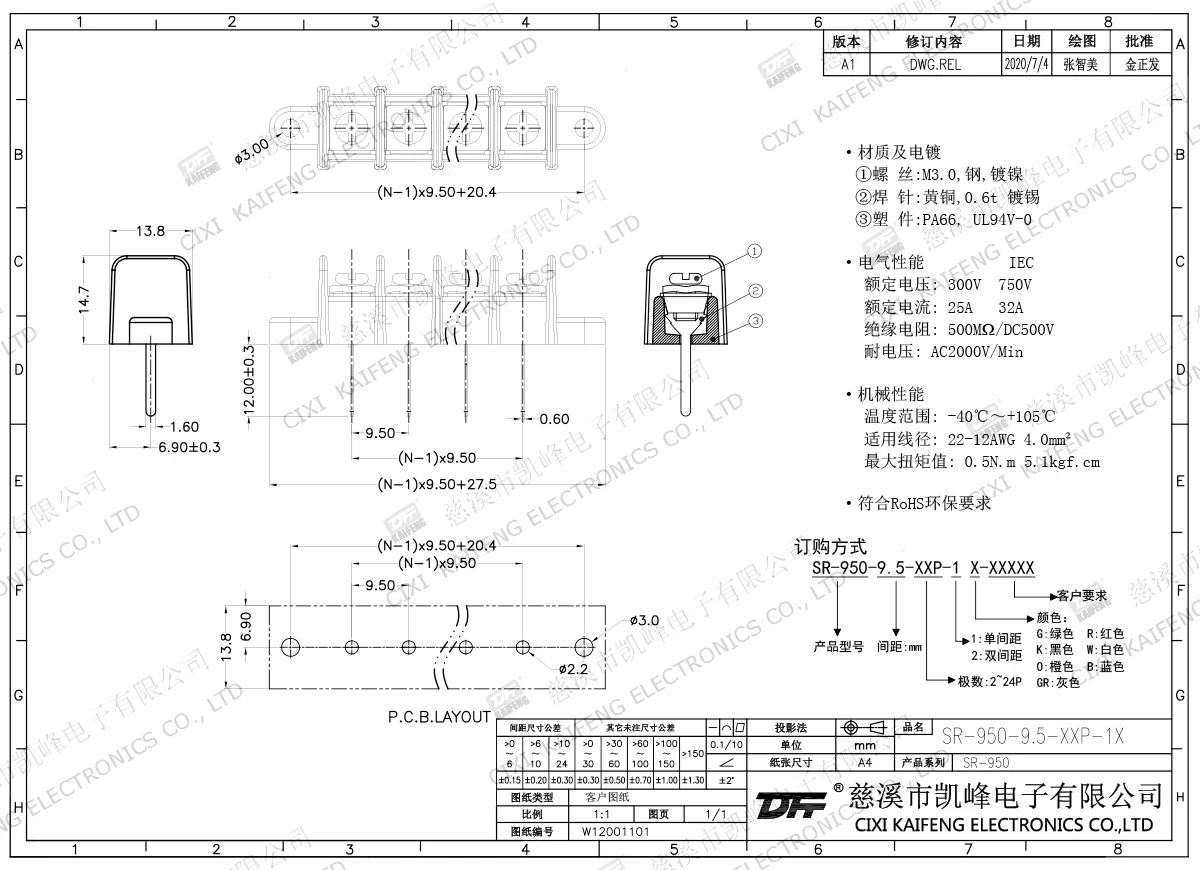 Material:M3.0 Steel,Ni platedTerminal:Brass,0.6t Ni platedHousing: PA66,UL94V-0ElectricalULIECRated voltage300V 750V Rated current25A32AInsulation resistance500MΩ/DC500VWithstanding voltage AC2000V/1minWire range22-12AWG 4.0mm²MechanlicalTemp.rang-40℃~+105℃ Torque0.5N.m 4.4Lb.in