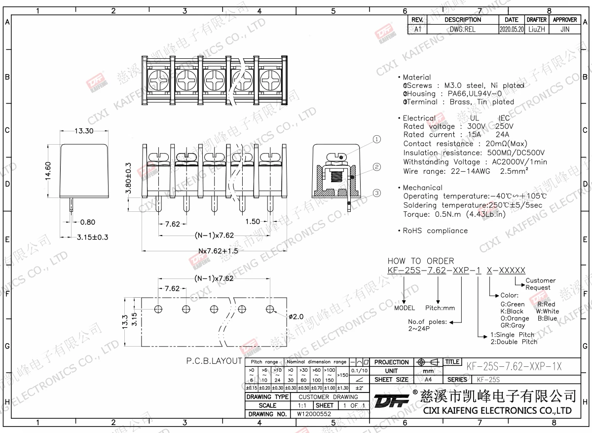 Material:M3.0 Steel,Ni platedTerminal:Brass,0.8t Ni platedHousing: PA66,UL94V-0ElectricalULIECRated voltage300V 250V Rated current15A24AInsulation resistance500MΩ/DC500VWithstanding voltage AC2000V/1minWire range22-14AWG 2.5mm²MechanlicalTemp.rang-40℃~+105℃ Torque0.5N.m 4.4Lb.in