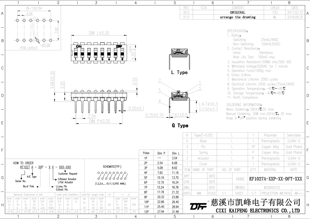 Material:SPECIFICATIONSRatingSwitching25mA,24VDCNon-Switching100mA,50VDCContact ResistanceInitial50mΩ/MaxAfter Life Test100mΩ/MaxInsulation Resistance100mΩ Min/500 VDCWithstand Vol