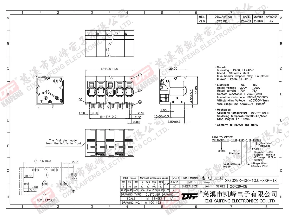 PCB Terminal Block 2KF029R-DB-10.0mm