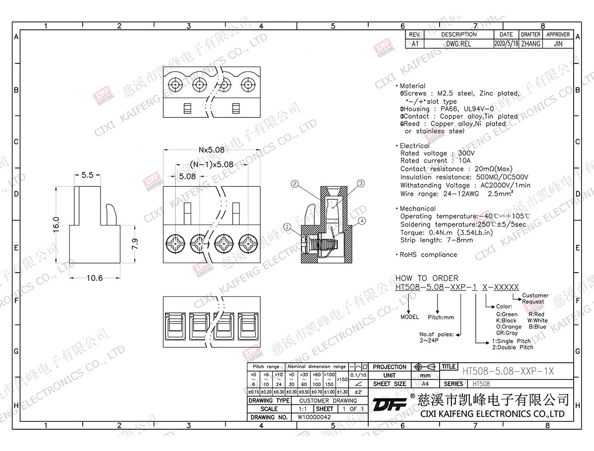 MATERIAL:M2.5,Steel Zinc platedcontact: Phosphor bronzePin header: -Housing: PA66,UL94V-0ElectricalULIECRated voltage300V 320V Rated current15A20AContact resistance20mΩInsulation resistance500MΩ/DC500VWithstanding voltage AC2000V/1minWire range24-12AWG 2.5mm²MechanicalTemp.rang-40℃~+105℃ Max.soldering+250℃, 5s