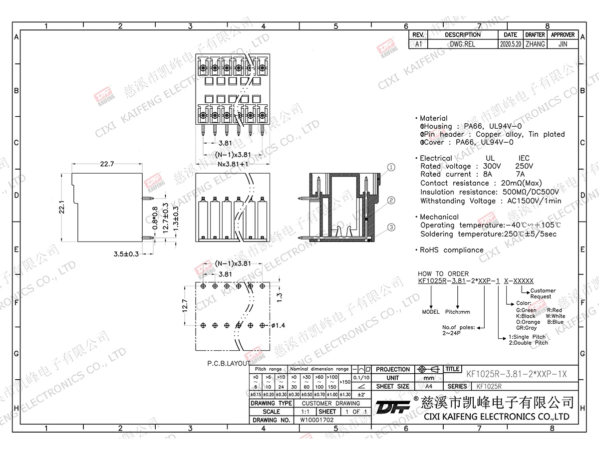 MATERIAL:contact: -Pin header: Brass, Tin platedHousing: PA66,UL94V-0ElectricalULIECRated voltage300V 250V Rated current8A7AContact resistance20mΩInsulation resistance500MΩ/DC500VWithstanding voltage AC1500V/1minWire range-MechanicalTemp.rang-40℃~+105℃ Max.soldering+250℃, 5secTorque-Strip length-