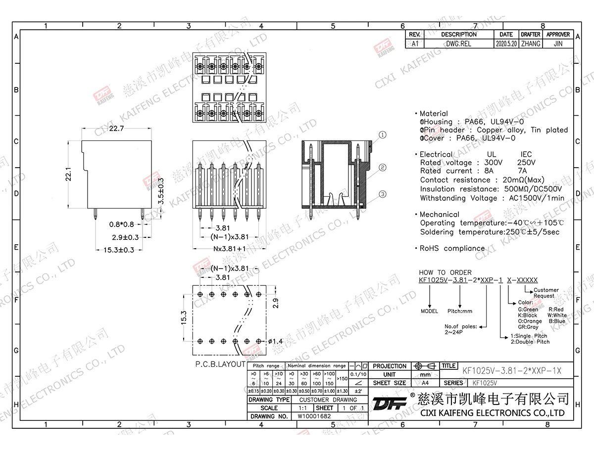 MATERIAL:contact: -Pin header: Brass, Tin platedHousing: PA66,UL94V-0ElectricalULIECRated voltage300V 250V Rated current8A7AContact resistance20mΩInsulation resistance500MΩ/DC500VWithstanding voltage AC1500V/1minWire range-MechanicalTemp.rang-40℃~+105℃ Max.soldering+250℃, 5secTorque-Strip length-