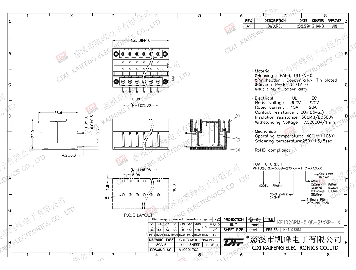 MATERIAL:MATERIALScrews: -contact: -Pin header: Brass, Tin platedHousing: PA66,UL94V-0ElectricalULIECRated voltage300V 320V Rated current15A20AContact resistance20mΩInsulation resistance500MΩ/DC500VWithstanding voltage AC2000V/1minWire range-MechanicalTemp.rang-40℃~+105℃ Max.soldering+250℃, 5secTorque-Strip length-