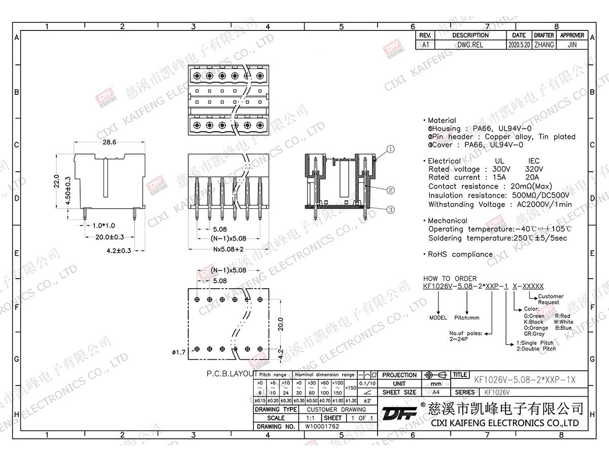 MATERIAL:MATERIALScrews: -contact: -Pin header: Brass, Tin platedHousing: PA66,UL94V-0ElectricalULIECRated voltage300V 320V Rated current15A20AContact resistance20mΩInsulation resistance500MΩ/DC500VWithstanding voltage AC2000V/1minWire range-MechanicalTemp.rang-40℃~+105℃ Max.soldering+250℃, 5secTorque-Strip length-