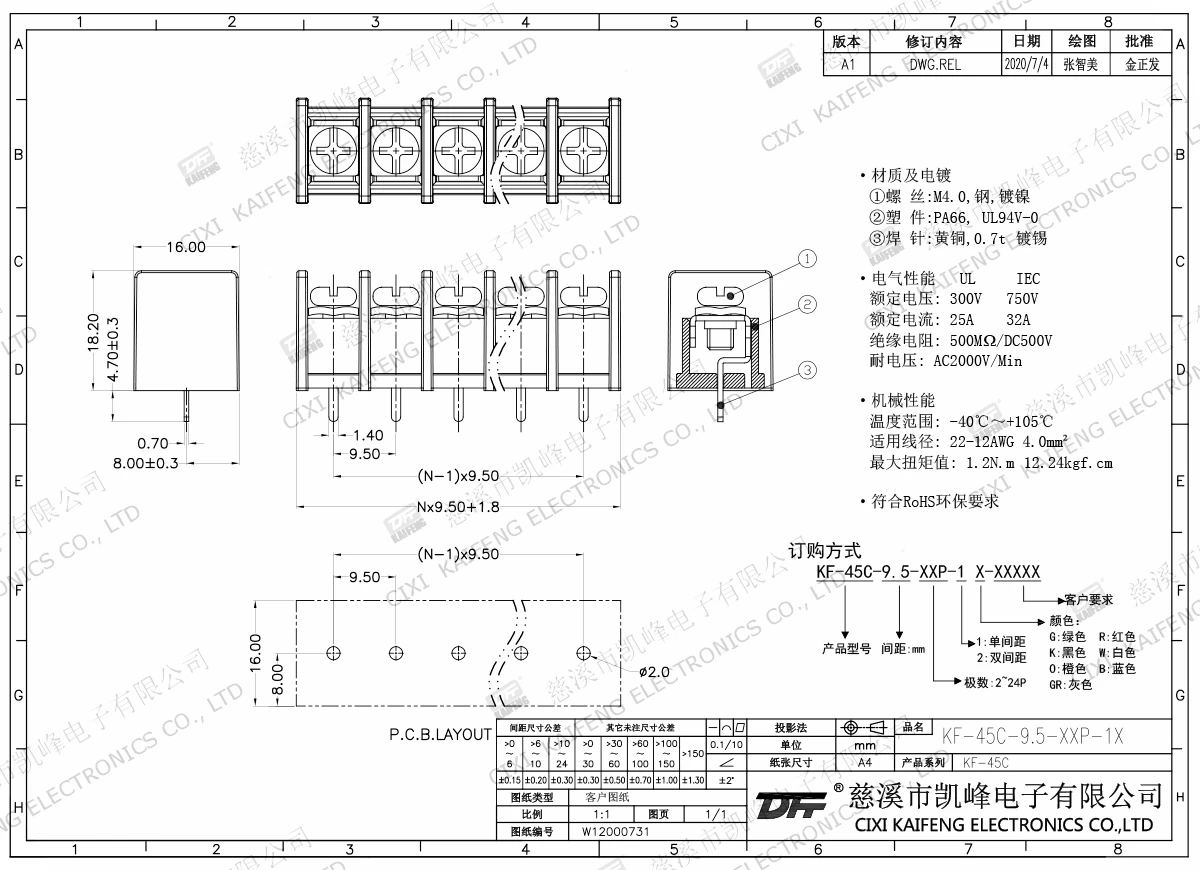 栅栏式接线端子 材质电镀:M4.0 钢,镀镍端子:黄铜,0.8t 镀镍塑件: PA66,UL94V-0电气性能ULIEC额定电压300V 750V 额定电流25A32A绝缘电阻500MΩ/DC500V耐电压AC2000V/1min使用线径22-12AWG 4.0mm²机械性能温度范围-40℃~+105℃ 扭矩1.2N.m 10.53Lb.in