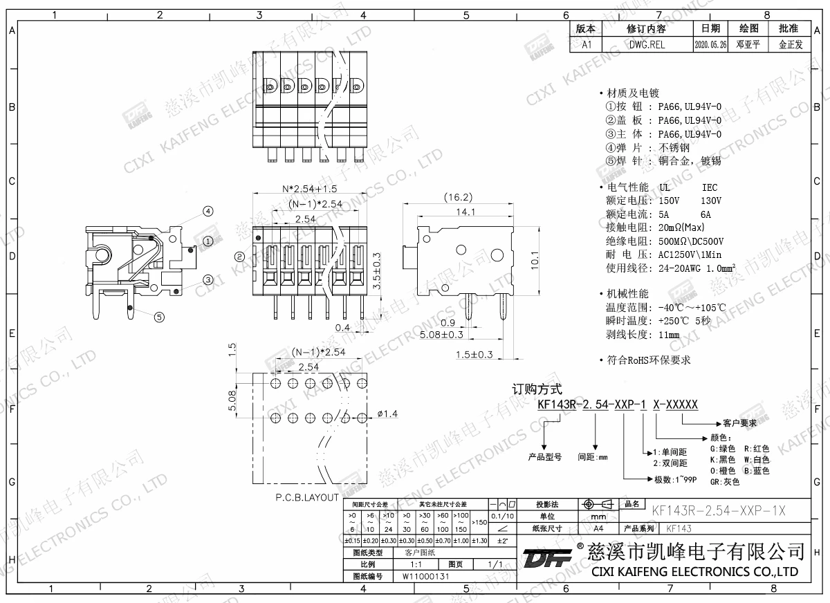 免螺丝式接线端子 材质电镀:①按钮:PA66,UL94V-0②盖板:PA66,UL94V-0③主体:PA66,UL94V-0④弹片:不锈钢⑤焊针:黄铜,镀锡电气性能ULIEC额定电压150V 130V 额定电流5A6A接触电阻20mΩ绝缘电阻500MΩ/DC500V耐电压AC1250V/1min使用线径24-20AWG 1.0mm²机械性能温度范围-40℃~+105℃ 瞬时温度+25
