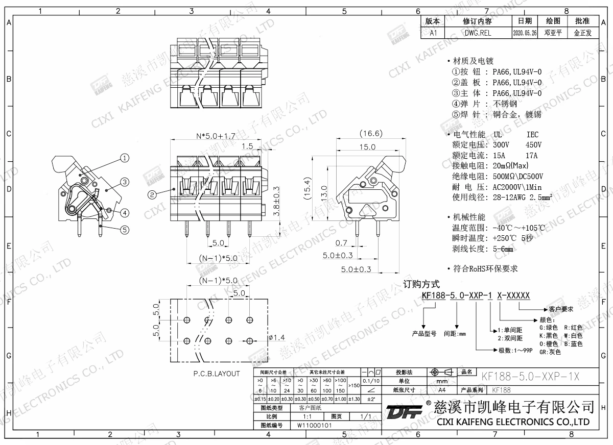 免螺丝式接线端子 材质电镀:①按钮:PA66,UL94V-0②盖板:PA66,UL94V-0③主体:PA66,UL94V-0④弹片:不锈钢⑤焊针:黄铜,镀锡电气性能ULIEC额定电压300V 450V额定电流15A17A接触电阻20mΩ绝缘电阻500MΩ/DC500V耐电压AC2000V/1min使用线径28-12AWG 2.5mm²机械性能温度范围-40℃~+105℃