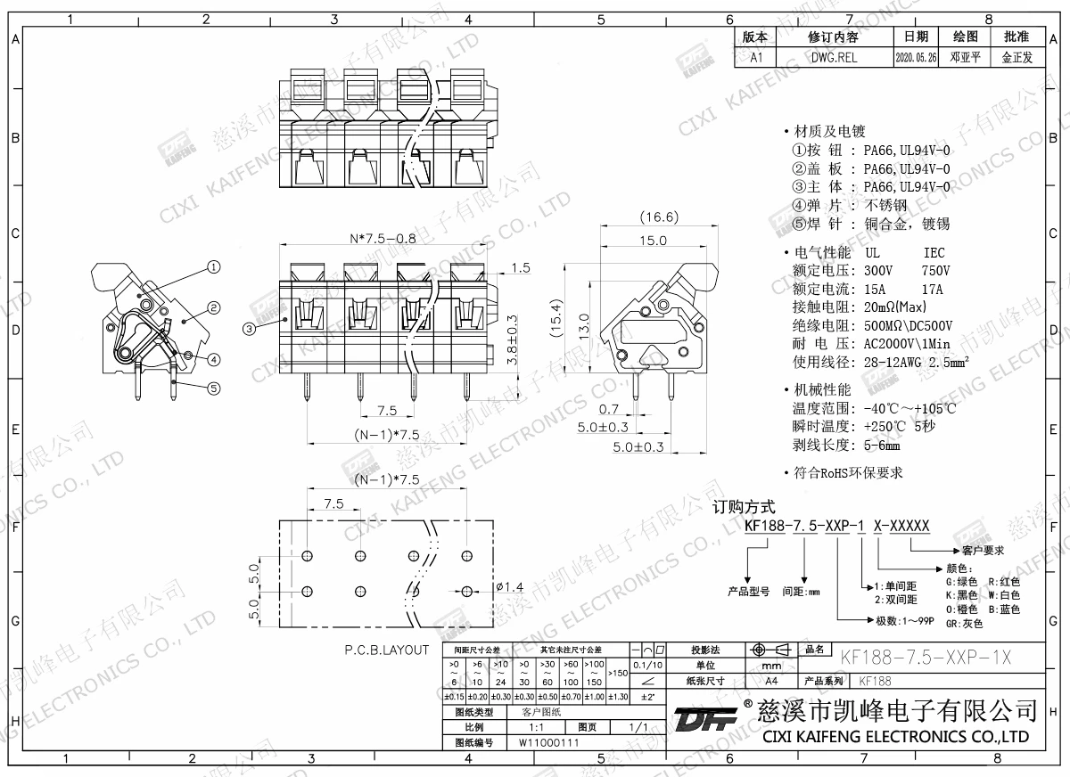 免螺丝式接线端子 材质电镀:①按钮:PA66,UL94V-0②盖板:PA66,UL94V-0③主体:PA66,UL94V-0④弹片:不锈钢⑤焊针:黄铜,镀锡电气性能ULIEC额定电压300V 750V额定电流15A17A接触电阻20mΩ绝缘电阻500MΩ/DC500V耐电压AC2000V/1min使用线径28-12AWG 2.5mm²机械性能温度范围-40℃~+105℃