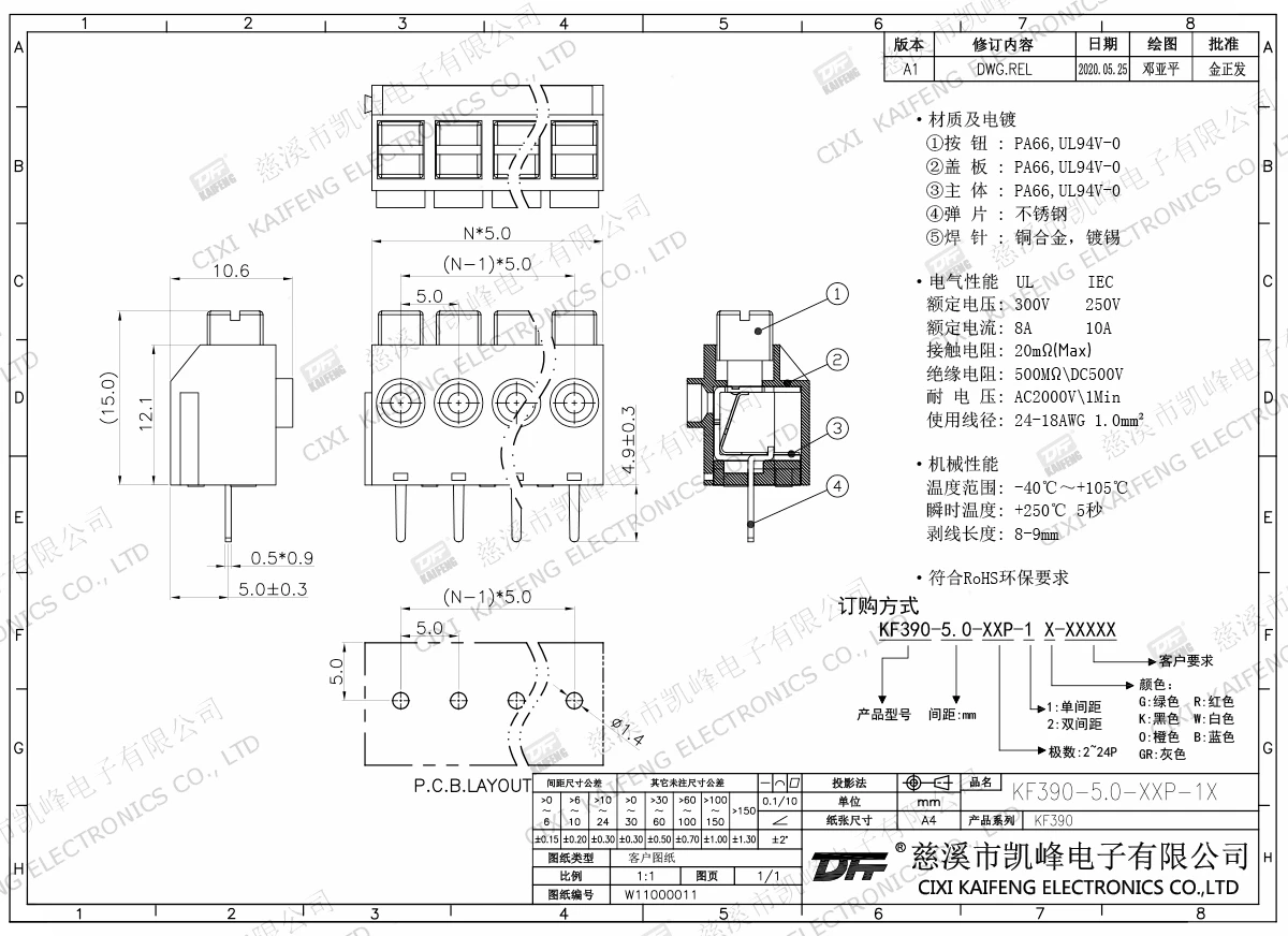 免螺丝式接线端子 材质电镀:材质及电镀①按钮:PA66,UL94V-0②盖板:PA66,UL94V-0③弹片:不锈钢④焊针:黄铜,镀锡电气性能ULIEC额定电压300V 250V 额定电流8A10A接触电阻20mΩ绝缘电阻500MΩ/DC500V耐电压AC2000V/1min使用线径24-18AWG 1.0mm²机械性能温度范围-40℃~+105℃ 瞬时温度+250℃,5sec扭矩-剥线长度8