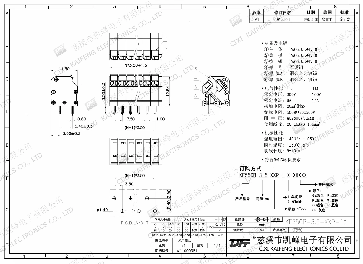免螺丝式接线端子 材质电镀:材质及电镀①边件:PA66,UL94V-0②中间件:PA66,UL94V-0③盖板:PA66,UL94V-0④按钮:PA66,UL94V-0⑤弹片:不锈钢⑥长焊脚:紫铜,镀锡⑦短焊脚:紫铜,镀锡电气性能ULIEC额定电压300V 320V 额定电流10A17.5A接触电阻20mΩ绝缘电阻500MΩ/DC500V耐电压AC2000V/1min使用线径26-16AWG 1.5mm²