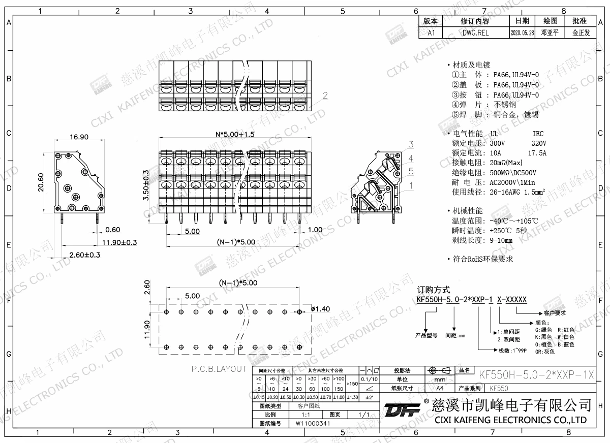 材质电镀:材质电镀:①边件:PA66,UL94V-0②中间件:PA66,UL94V-0③盖板:PA66,UL94V-0④按钮:PA66,UL94V-0⑤弹片:不锈钢⑥长焊脚:紫铜,镀锡⑦短焊脚:紫铜,镀锡电气性能ULIEC额定电压300V 320V 额定电流10A17.5A接触电阻20mΩ绝缘电阻500MΩ/DC500V耐电压AC2000V/1min使用线径26-16AWG 1.5mm²