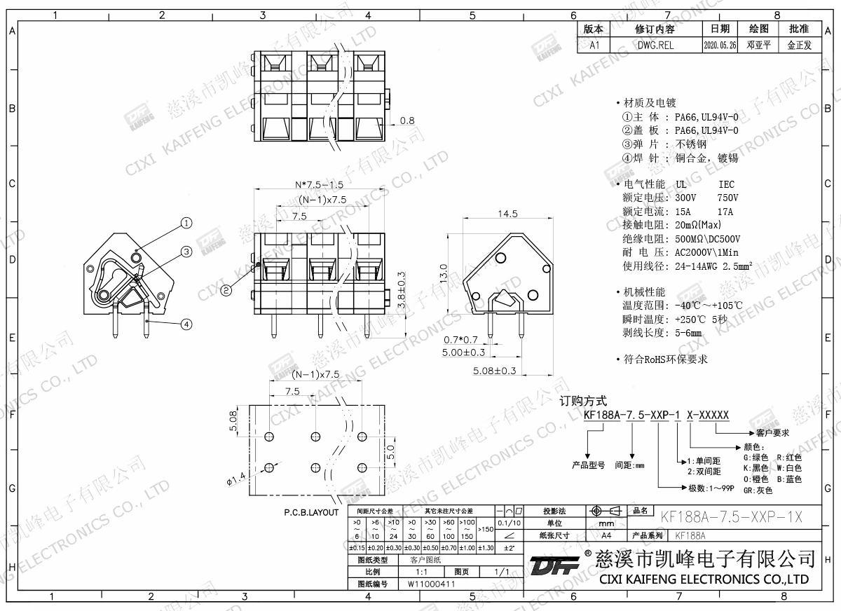 免螺丝式接线端子 材质电镀:材质及电镀①主体:PA66,UL94V-0②盖板:PA66,UL94V-0③弹片:不锈钢④焊针:黄铜,镀锡电气性能ULIEC额定电压300V 1000V额定电流15A17A接触电阻20mΩ绝缘电阻500MΩ/DC500V耐电压AC2000V/1min使用线径24-14AWG 2.5mm²机械性能温度范围-40℃~+105℃ 瞬时温度+250℃,5sec扭矩