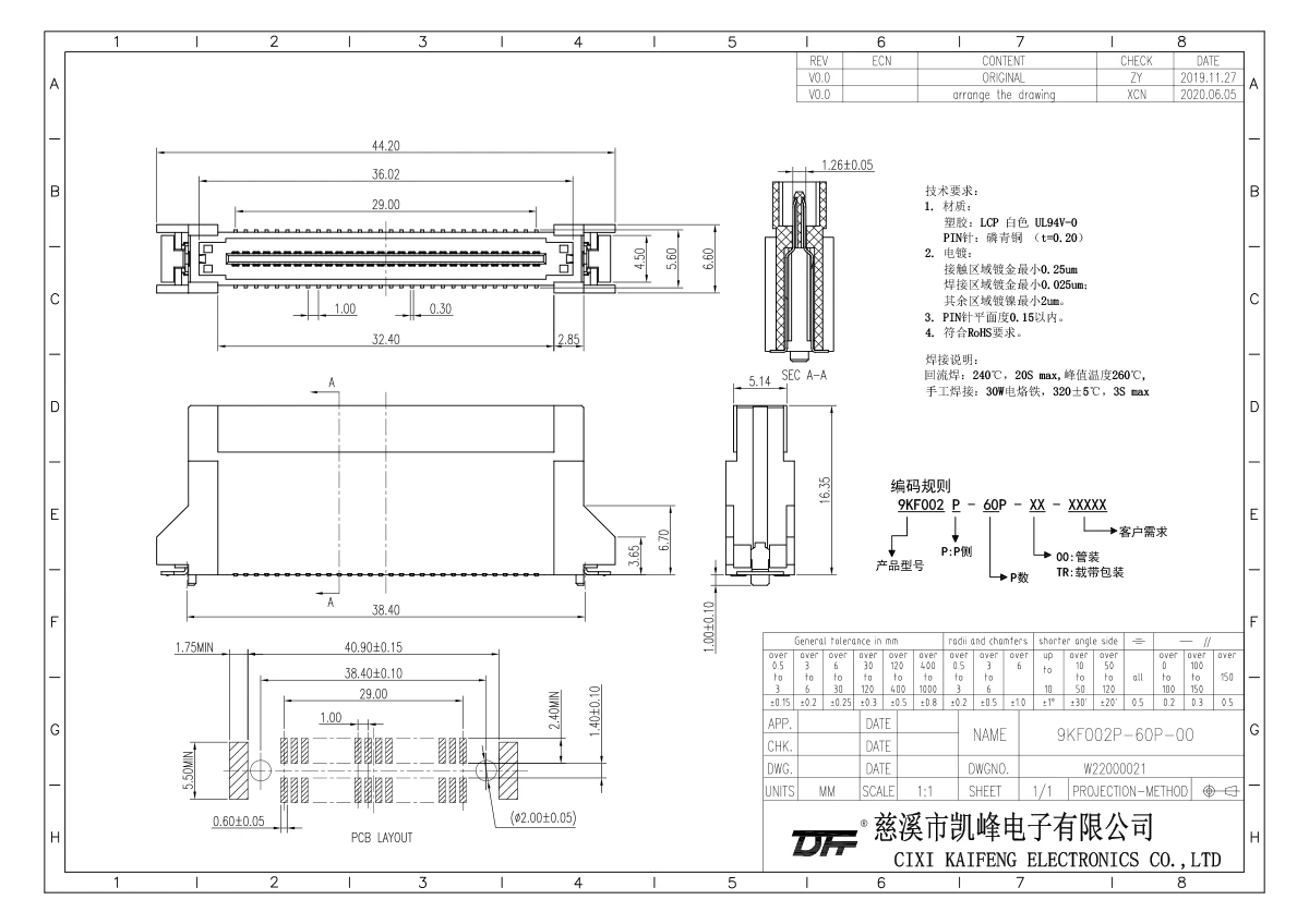 材质电镀:材质说明塑胶LCP 白色 UL94V-0PIN针磷青铜(t=0.20)电镀接触区域镀金最小0.25um;焊接区域镀金最小0.025um;其余区域镀镍最小2um;PIN针平面度0.15以内符合ROHS要求焊接说明:回流焊:240,20s max,峰值温度260,手工焊接:30W电洛铁,320正负5,3S max