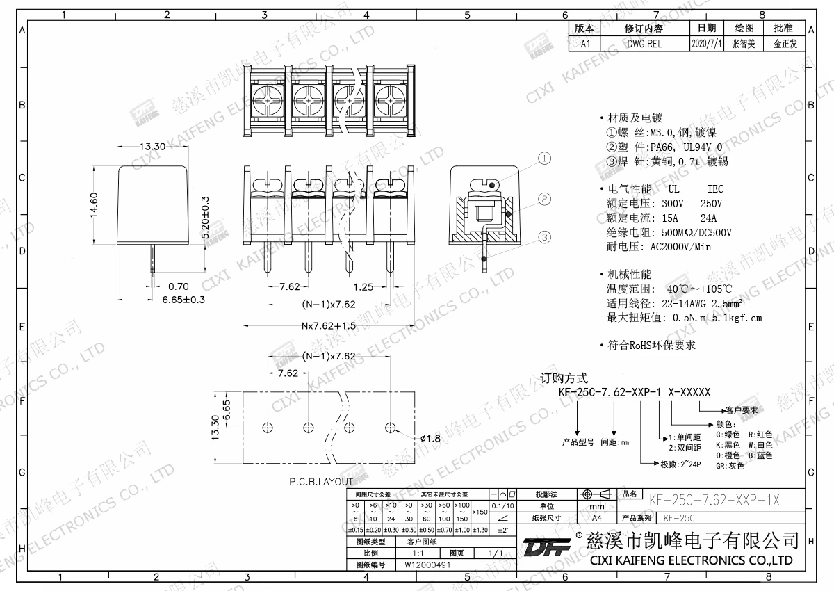栅栏式接线端子 材质电镀:M3.0 钢,镀镍端子:黄铜,0.7t 镀镍塑件: PA66,UL94V-0电气性能ULIEC额定电压300V 250V 额定电流15A24A绝缘电阻500MΩ/DC500V耐电压AC2000V/1min使用线径22-14AWG 2.5mm²机械性能温度范围-40℃~+105℃ 扭矩0.5N.m 4.4Lb.in